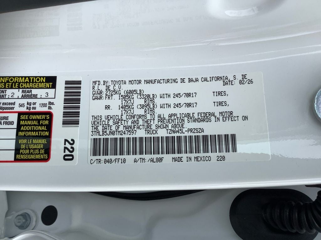 4WD, 3.583 Axle Ratio, 4-Wheel Disc Brakes, 6 Speakers, ABS brakes, Air Conditioning, All Weather Floor Liners, Alloy wheels, AM/FM radio: SiriusXM, Anti-whiplash front head restraints, Apple CarPlay/Android Auto, Auto High-beam Headlights, Auto-dimming Rear-View mirror, Brake assist, Bumpers: body-color, Driver door bin, Dual front impact airbags, Dual front side impact airbags, Electronic Stability Control, Emergency communication system: Safety Connect (up to 10-year trial subscription), Exterior Parking Camera Rear, Fabric Seat Trim, Four wheel independent suspension, Front anti-roll bar, Front Bucket Seats, Front Center Armrest, Front fog lights, Front reading lights, Fully automatic headlights, Heated door mirrors, Heated Seats, Illuminated entry, JBL Premium Audio, Knee airbag, Low tire pressure warning, Occupant sensing airbag, Outside temperature display, Overhead airbag, Overhead console, Panic alarm, Passenger door bin, Power door mirrors, Power steering, Power windows, Radio: 8 Toyota Audio Multimedia, Rear step bumper, Rear window defroster, Remote keyless entry, Speed control, Speed-sensing steering, Split folding rear seat, Steering wheel mounted audio controls, Tachometer, Telescoping steering wheel, Tilt steering wheel, Traction control, Trip computer, Variably intermittent wipers, and Wheels: 17 Styled Alloy.