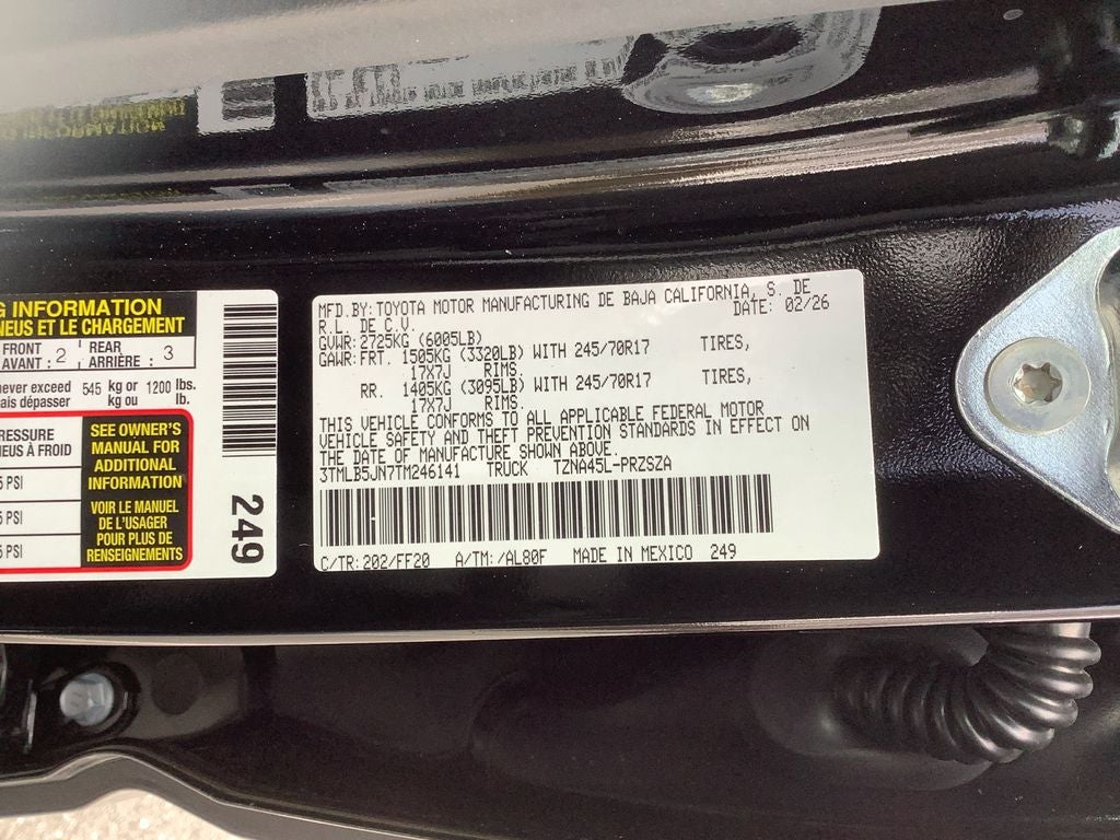 4WD, 3.583 Axle Ratio, 4-Wheel Disc Brakes, 6 Speakers, ABS brakes, Air Conditioning, All Weather Floor Liners, Alloy wheels, AM/FM radio: SiriusXM, Anti-whiplash front head restraints, Apple CarPlay/Android Auto, Auto High-beam Headlights, Auto-dimming Rear-View mirror, Brake assist, Bumpers: body-color, Driver door bin, Dual front impact airbags, Dual front side impact airbags, Electronic Stability Control, Emergency communication system: Safety Connect (up to 10-year trial subscription), Exterior Parking Camera Rear, Fabric Seat Trim, Four wheel independent suspension, Front anti-roll bar, Front Bucket Seats, Front Center Armrest, Front fog lights, Front reading lights, Fully automatic headlights, Heated door mirrors, Heated Seats, Illuminated entry, JBL Premium Audio, Knee airbag, Low tire pressure warning, Occupant sensing airbag, Outside temperature display, Overhead airbag, Overhead console, Panic alarm, Passenger door bin, Power door mirrors, Power steering, Power windows, Radio: 8 Toyota Audio Multimedia, Rear step bumper, Rear window defroster, Remote keyless entry, Speed control, Speed-sensing steering, Split folding rear seat, Steering wheel mounted audio controls, Tachometer, Telescoping steering wheel, Tilt steering wheel, Traction control, Trip computer, Variably intermittent wipers, and Wheels: 17 Styled Alloy.